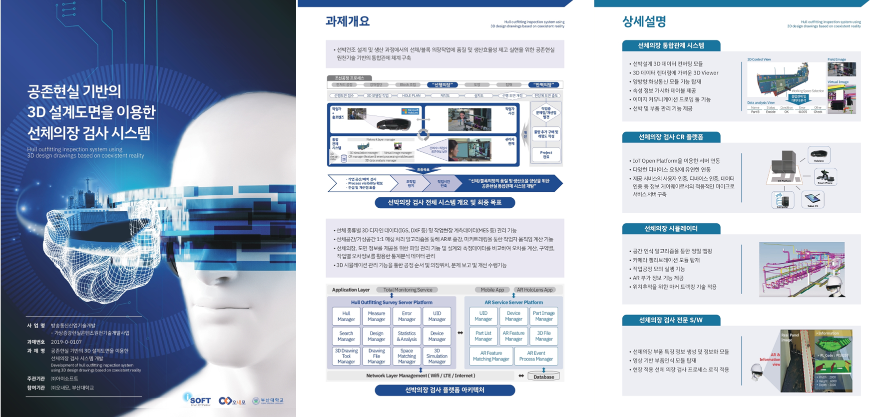 공존현실 기반의 3D 설계도면을 이용한선체의장 검사 시스템은 선박건조 설계 및 생산과정에서의 선체/블록 의장작ㅇ럽에 품질 및 생상효율성 제고 실현을 위한 공존현실 원천기술 기반의 통합관제 체계 구축 솔루션입니다.